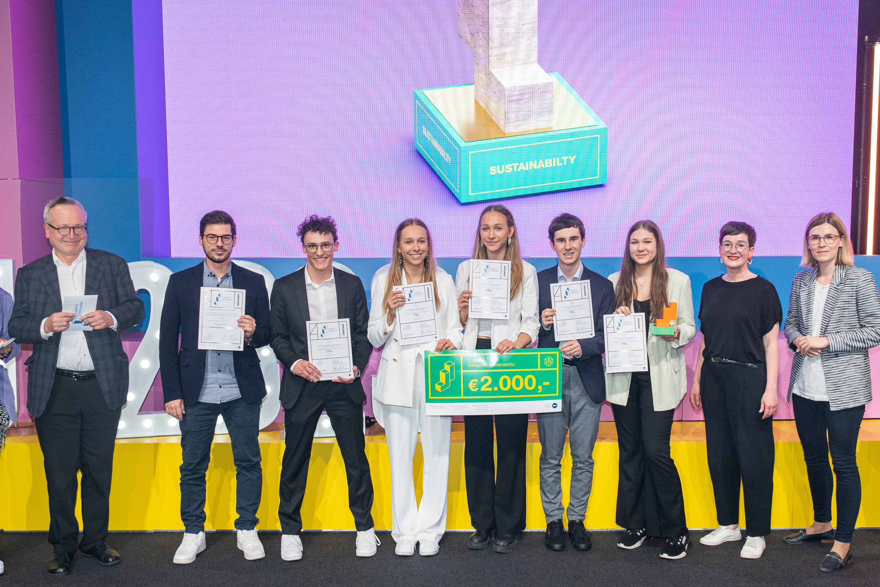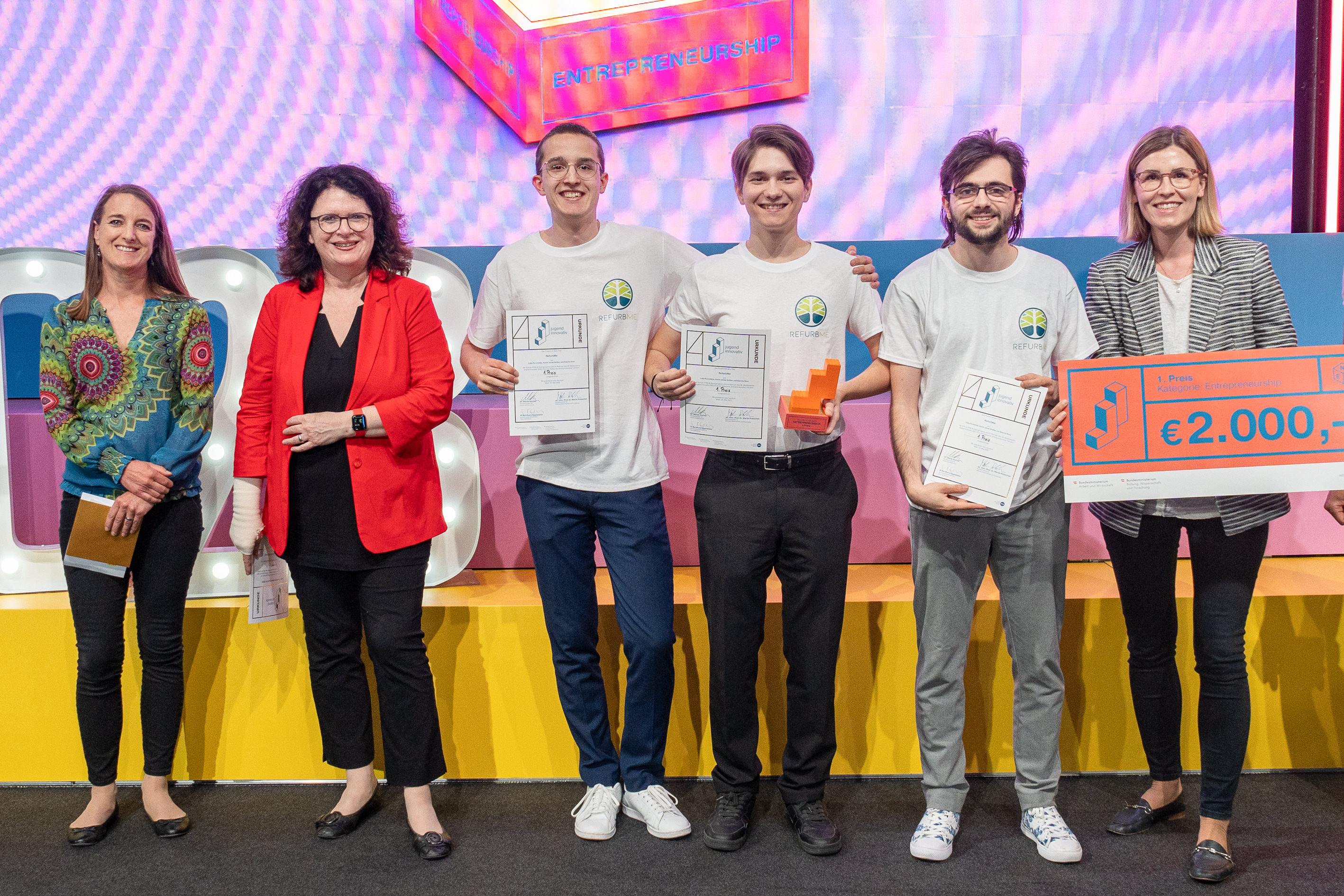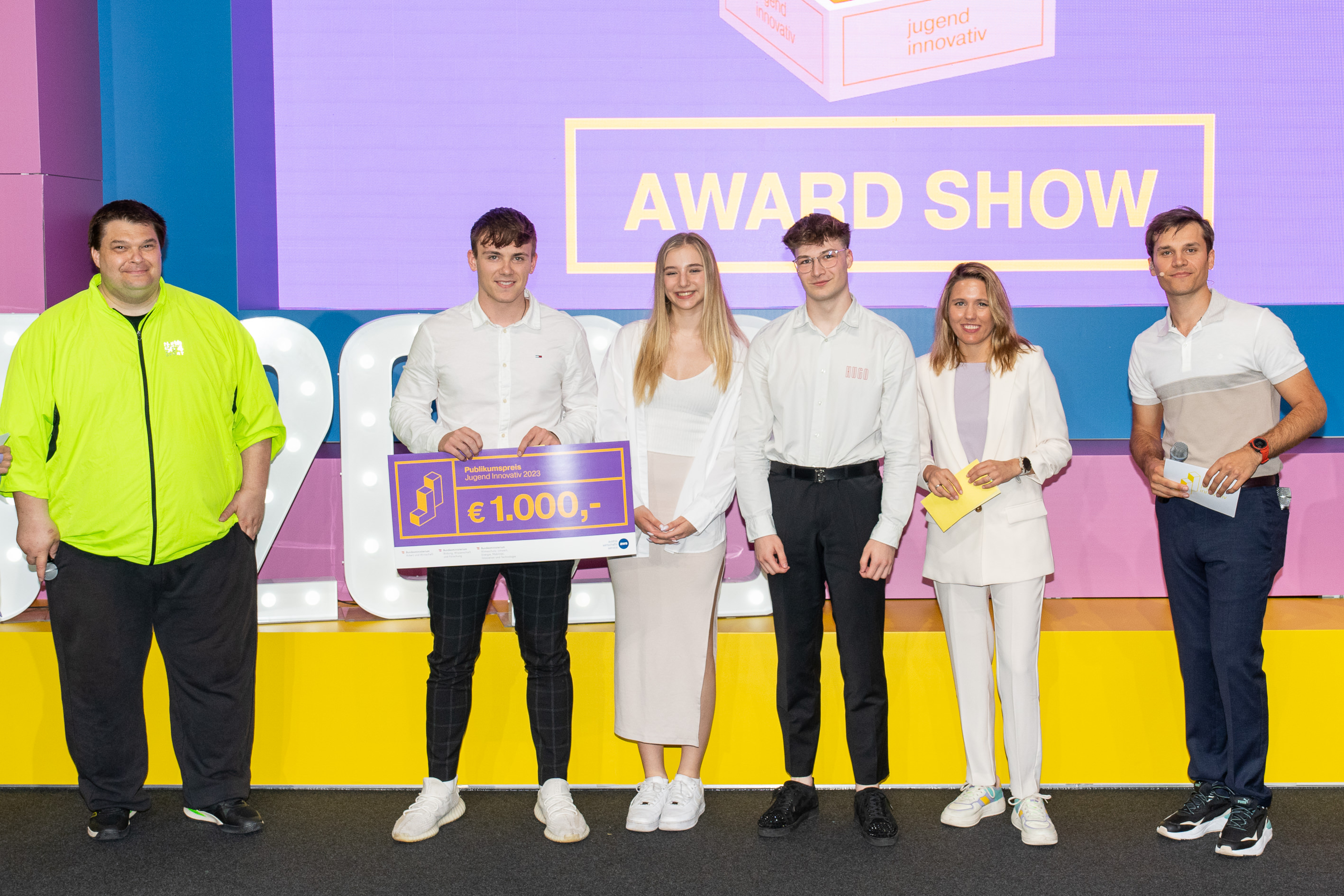 vlnr: Moderatorin Ryue, Jury Aichinger, SC Wagner BMBFW, Siegerteam, Projektbetreuer Wittmann, GS Landrichtinger BMAW