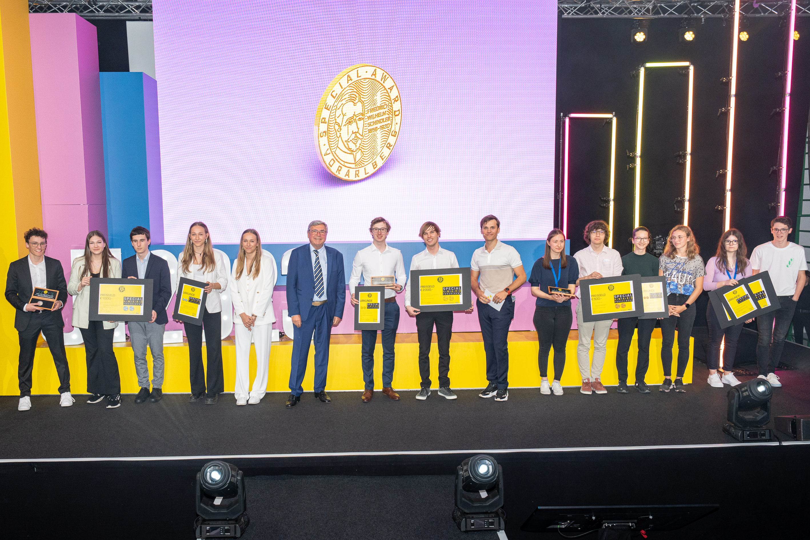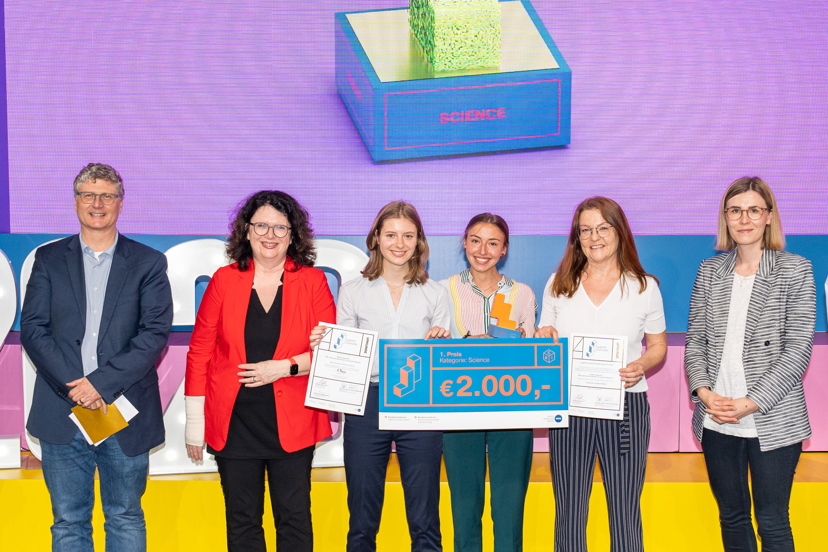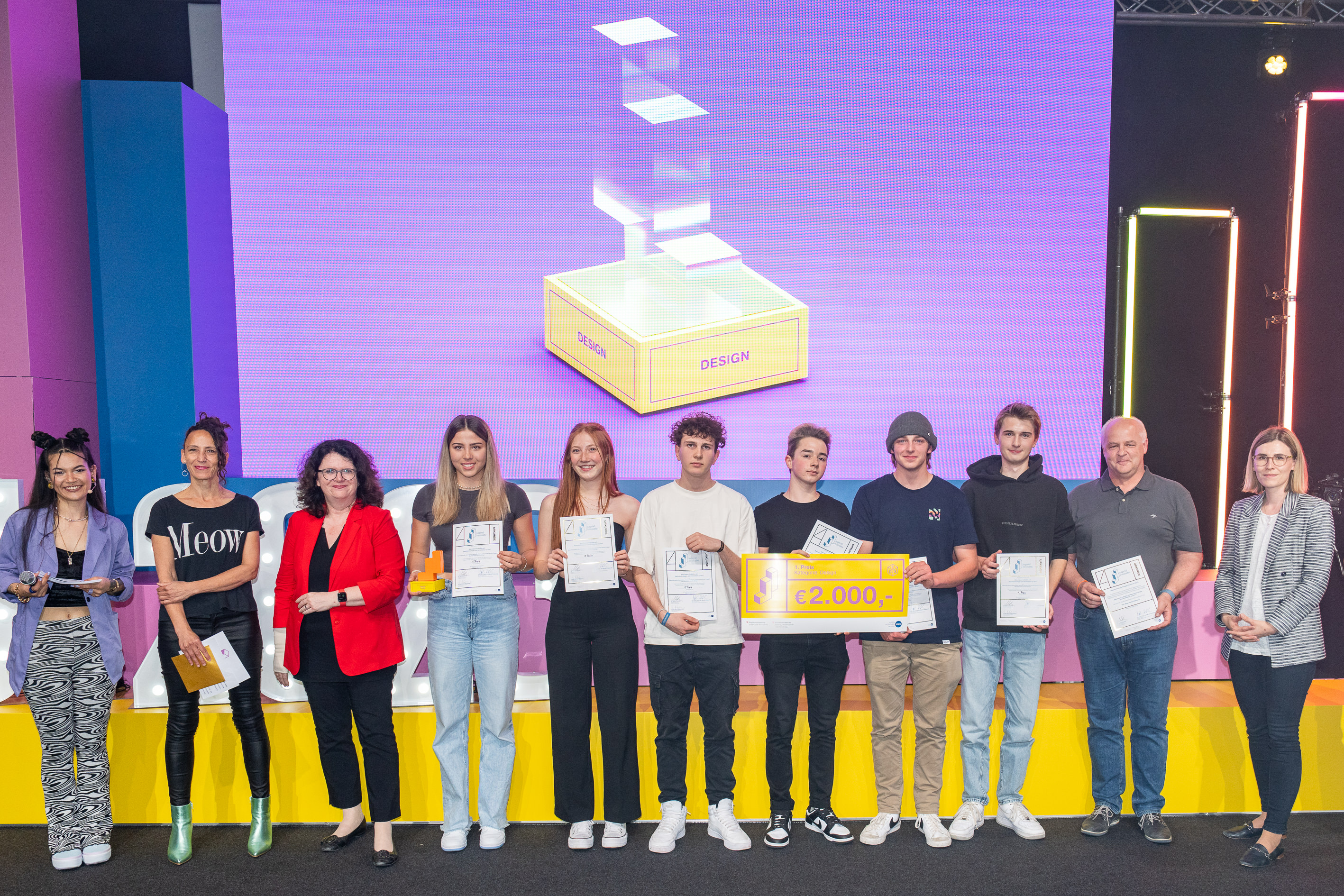 vlnr: Moderatorin Ryue, Jury Aichinger, SC Wagner BMBFW, Siegerteam, Projektbetreuer Wittmann, GS Landrichtinger BMAW