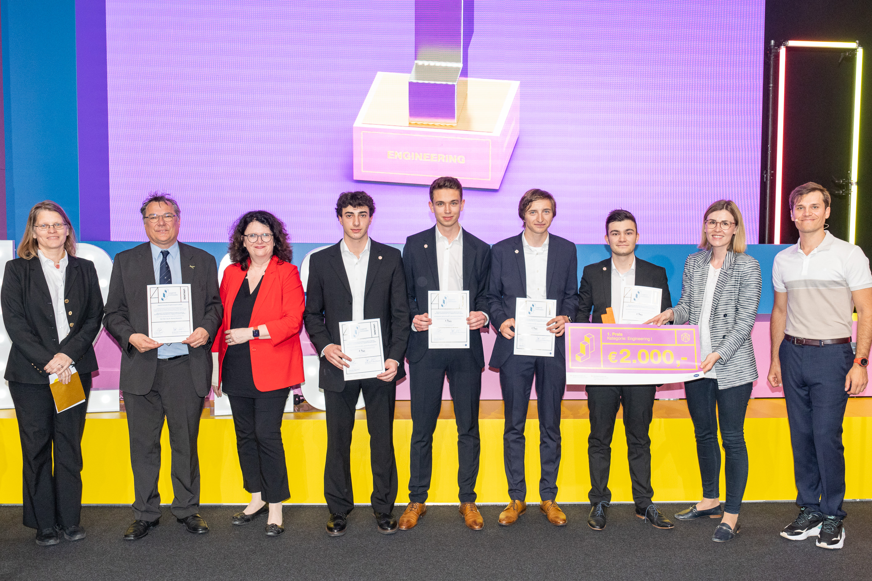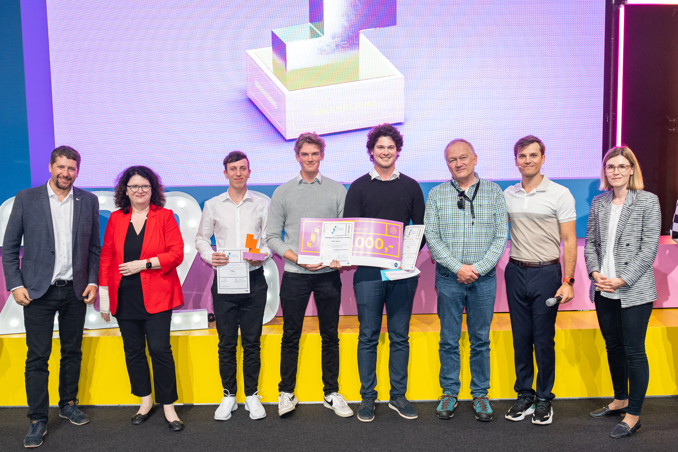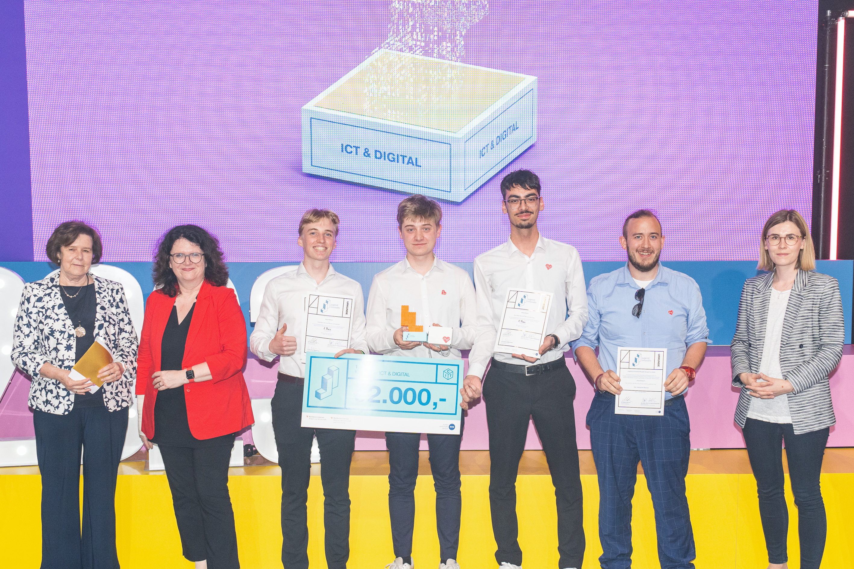 vlnr: Jury Rasinger, SC Wagner BMBWF, Siegerteam, Projektbetreuer Kukutschki, Moderator Unger, GS Landrichtinger BMAW